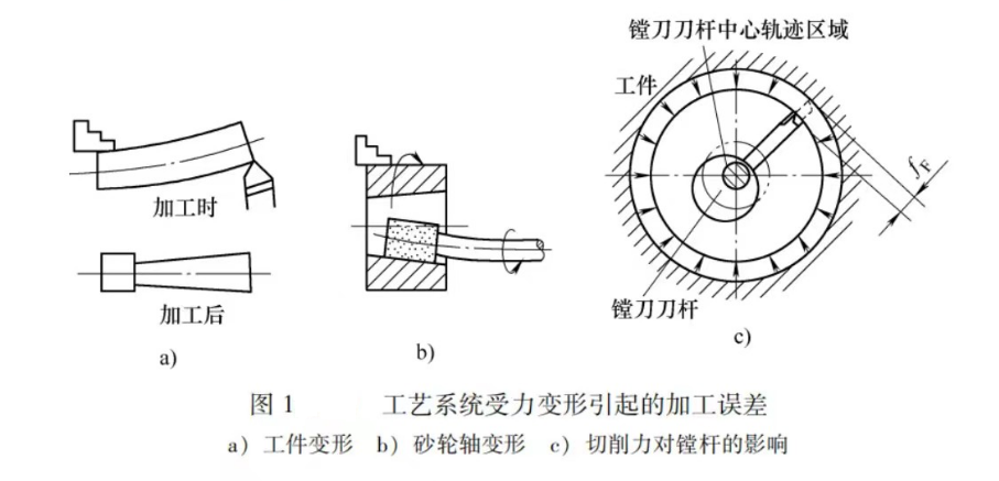 工藝系統在切削力、傳動力、慣性力、夾緊力以及重力等外力的作用下,產生相應的變形和振動,將會破壞刀具和工件之間的成形運動的位置關系和速度關系,影響切削運動的穩(wěn)定性,從而產生各種加工誤差,并使加工表面粗糙和產生波紋度。圖1所示為工藝系統受力變形引起的加工誤差。