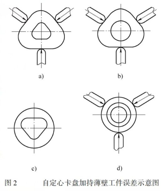 除切削力外,傳動力、慣性力、夾緊力等其他作用力也會使工藝系統發(fā)生變化,從而引起加工誤差,影響加工質量。裝夾時,工件剛性較差或夾緊力大小不當時也會使工件產生相應的變形,造成加工誤差。圖2所示為自定心卡盤加持薄壁工件誤差示意圖。為了減少加工誤差,應使夾緊力均勻分布,可采用開口過渡環(huán)裝夾,如圖2d所示。