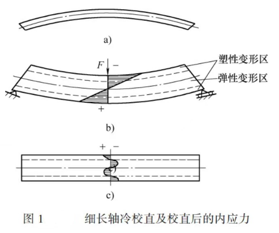 2) 冷校直產(chǎn)生的內(nèi)應力。一些剛性較差、容易變形的工件(如絲杠),通常采用冷校直的方法修正變形。圖1b所示的工件中部受到載荷F的作用時,工件內(nèi)部產(chǎn)生應力,其軸心線以上產(chǎn)生壓應力,其軸心線以下產(chǎn)生拉伸應力,而且兩條虛線之間為彈性變形區(qū),虛線之外為塑性變性區(qū)。去掉外力后,工件的彈性恢復收到塑性變形區(qū)的阻礙,致使內(nèi)應力重新分布如圖1c所示。由此可見,工件經(jīng)冷校直后內(nèi)部產(chǎn)生內(nèi)應力,處于不穩(wěn)定狀態(tài)。