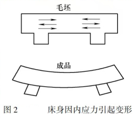3) 切削加工中產(chǎn)生的內(nèi)應力。工件切削加工時,在各種力和熱的作用下,各部分將產(chǎn)生不同程度的塑性變形及金相組織變化從而產(chǎn)生內(nèi)應力,引起工件變形。實踐證明,在加工過程中切去表面一層金屬后,所引起內(nèi)應力重新分布,變形最為劇烈。因此粗加工后,應將被夾緊的工件松開使它有時間使內(nèi)應力重新分布。否則,在繼續(xù)加工時工件處于彈性應力狀態(tài)下,而在加工完成后必然要逐漸產(chǎn)生變形,致使破壞最終工序所得到的精度。圖2所示為床身因內(nèi)應力引起變形。