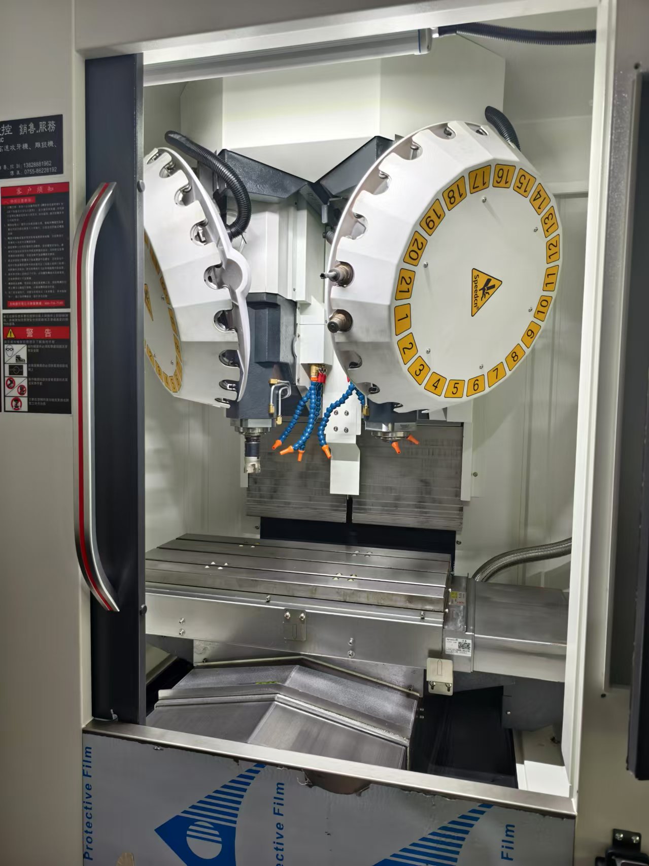 雙主軸加工中心:具有兩個(gè)加工機(jī)頭、兩個(gè)加工臺(tái)面以及兩個(gè)刀庫,能夠同時(shí)對(duì)兩個(gè)產(chǎn)品進(jìn)行加工。這種設(shè)計(jì)顯著提升了生產(chǎn)效率,使得在相同時(shí)間內(nèi)可以完成兩個(gè)產(chǎn)品的加工任務(wù)。